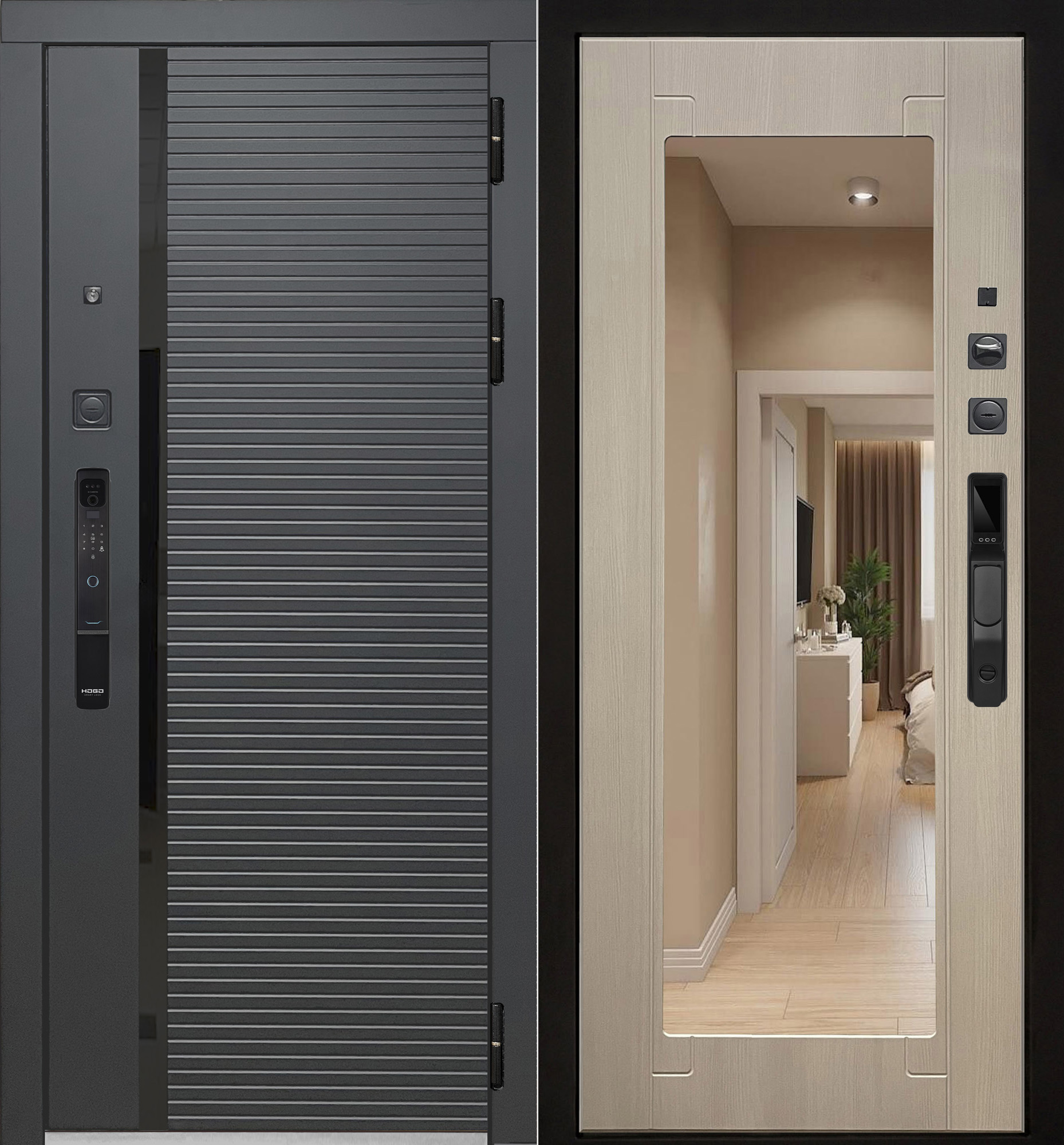 Установка двери не по уровню, перетянутая панель в районе замковой группы, цилиндра, глазка при проведении монтажных работ — могут послужить причиной появления искажений отражения в зеркальном декоративном элементе.